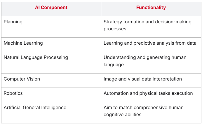 Artificial Intelligence (AI) serves as the backbone for numerous technological advancements, resting upon key components that enable it to mirror and extend human intelligence. At its core, AI consists of several disciplines, including Planning, Machine Learning (ML), Natural Language Processing, Computer Vision, Robotics, and ultimately striving towards Artificial General Intelligence.