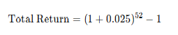 - Weekly Return of 2.5%: If a trader earns an average of 2.5% per week and reinvests their gains, the total annual return can be calculated using the formula for compound growth: